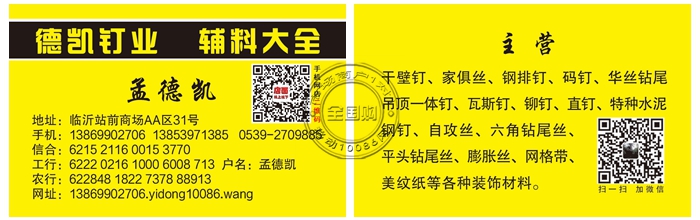 主营 干壁钉、家俱丝、钢排钉、码钉、蚊钉、直钉、特种水泥钢钉、自攻丝、六角钻尾丝、平头钻尾丝、膨胀丝、嵌缝带、牛皮纸、美纹纸等各种装饰材料。